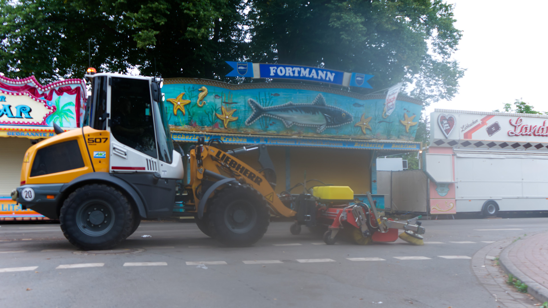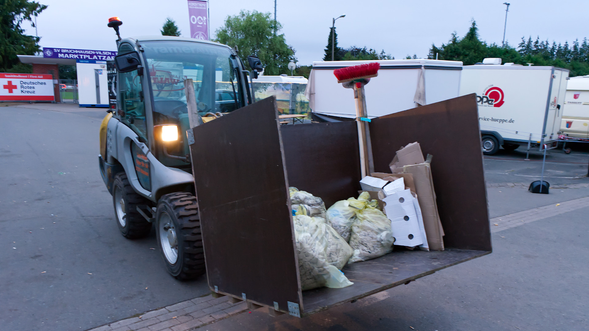 Das Team teilt sich auf. Ein Doppelgespann treibt mit Laubbläsern losen Abfall zusammen, sodas er mit einer Kehrmaschine aufgesammelt warden kann. Ein weiterer zieht mit einem kleinen Radlader los und sammelt die vollen Säcke ein. Reinhold Müller schließt sich Manuela und Markus vom Hilfsservice an - man duzt sich nordisch gelassen. Das Trio macht sich direkt auf zum Sportplatz. Auf dem Weg dorthin sondiert Müller die Lage. „Das sieht auf den ersten Blick dieses Jahr viel sauberer aus“, staunt er und erinnert sich an vermüllte Kreuzungen früherer Ausgaben des Brokser Marktes. Schwer zu glauben, säumen doch etliche Alkoholflaschen, Pommesschalen, Trinkbehälter, zerbrochene Flaschen und mehr die Wege. Das rascheln der Abfallbeutel kündigt an, dass die Reinigungsprofis zu Werke gehen. Im Sekundentakt landen die Hinterlassenschaften in den Säcken.