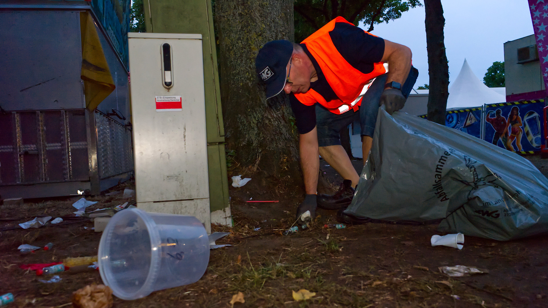 Mittlerweile ist Reinhold Müller auf einem der Parkplätze angekommen. Wo sich am Tag die Autos aneinander reihen, weht jetzt eine Papierserviette wie in einem Western über den Acker und wird von einem Bierglas aufgehalten. Zusammen mit einer leeren Energy-Drink-Dose wandert sie wenige Sekunden später in den Sack zu den anderen Hinterlassenschaften. Der Abfall an sich hat sich auf dem Freimarkt nicht verändert, sagt Müller, von Nachhaltigkeit keine Spur. Eine Veränderung macht er dennoch aus: „Die Menschen scheinen besser aufzupassen und ihren Abfall auch wirklich wegzuwerfen. Es liegt weniger herum als sonst.“ Ein achtsamer Umgang mit den Abfällen wird auch auf den Stromkästen sichtbar, auf denen Pfandflaschen zusammengestellt wurden.
