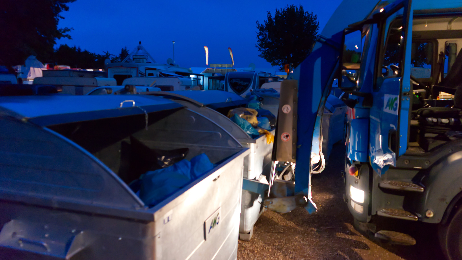 „Früher sind wir mit einem Hecklader durch die Straße gefahren, haben die Abfälle in Säcken gesammelt und diese dann hinten in die Schüttung geworfen“, blickt Müller während der Arbeit zurück. Anfang der 2000er-Jahre wurde das Verfahren optimiert. Seitdem gibt es einen Sammelplatz mit Großbehältern für die Abfälle der Schaustellerinne und Schausteller sowie Besucherinnen und Besucher. Schon nach dem ersten Markttag ist einer der Altpapiercontainer bis zum Rand gefüllt. AWG-Fahrer Florian Meyer kippt gerade einen Restabfallcontainer mit seinem Überkopflader. Bei der Wiegung im Entsorgungszentrum Bassum erfährt er, dass er am ersten von ingesamt vier Leerungstagen rund 3,8 Tonnen Abfälle vom Brokser Markt eingesammelt hat.